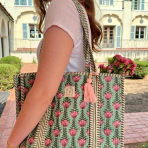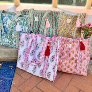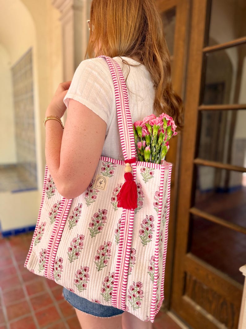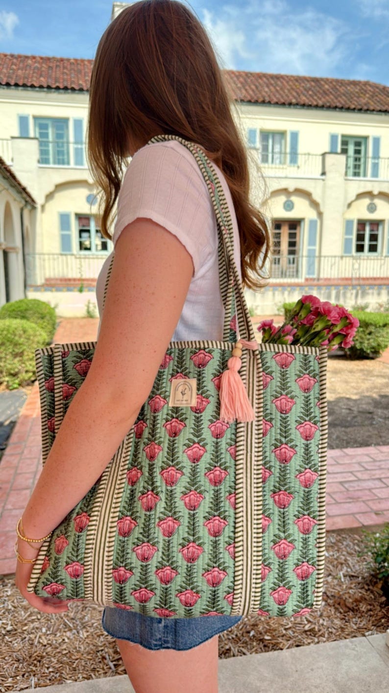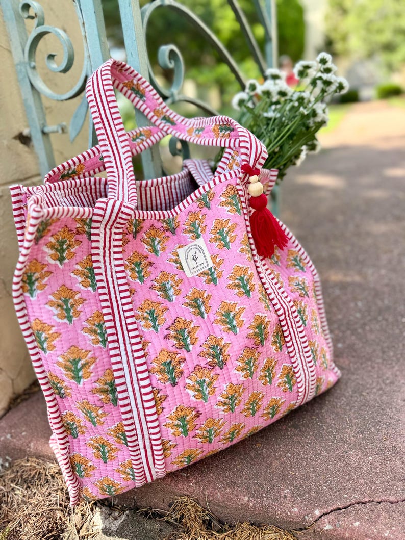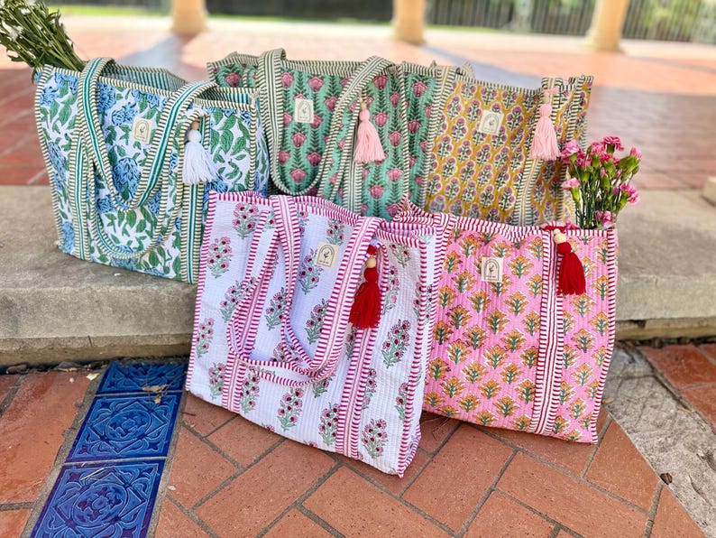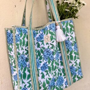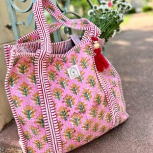 Cotton Quilted Tote Bag, Boho Floral Hand Block Printed Shopping Bags, Beach Bag, Travel and Shoulder Tote Bags, Women Gifts, Sustainable